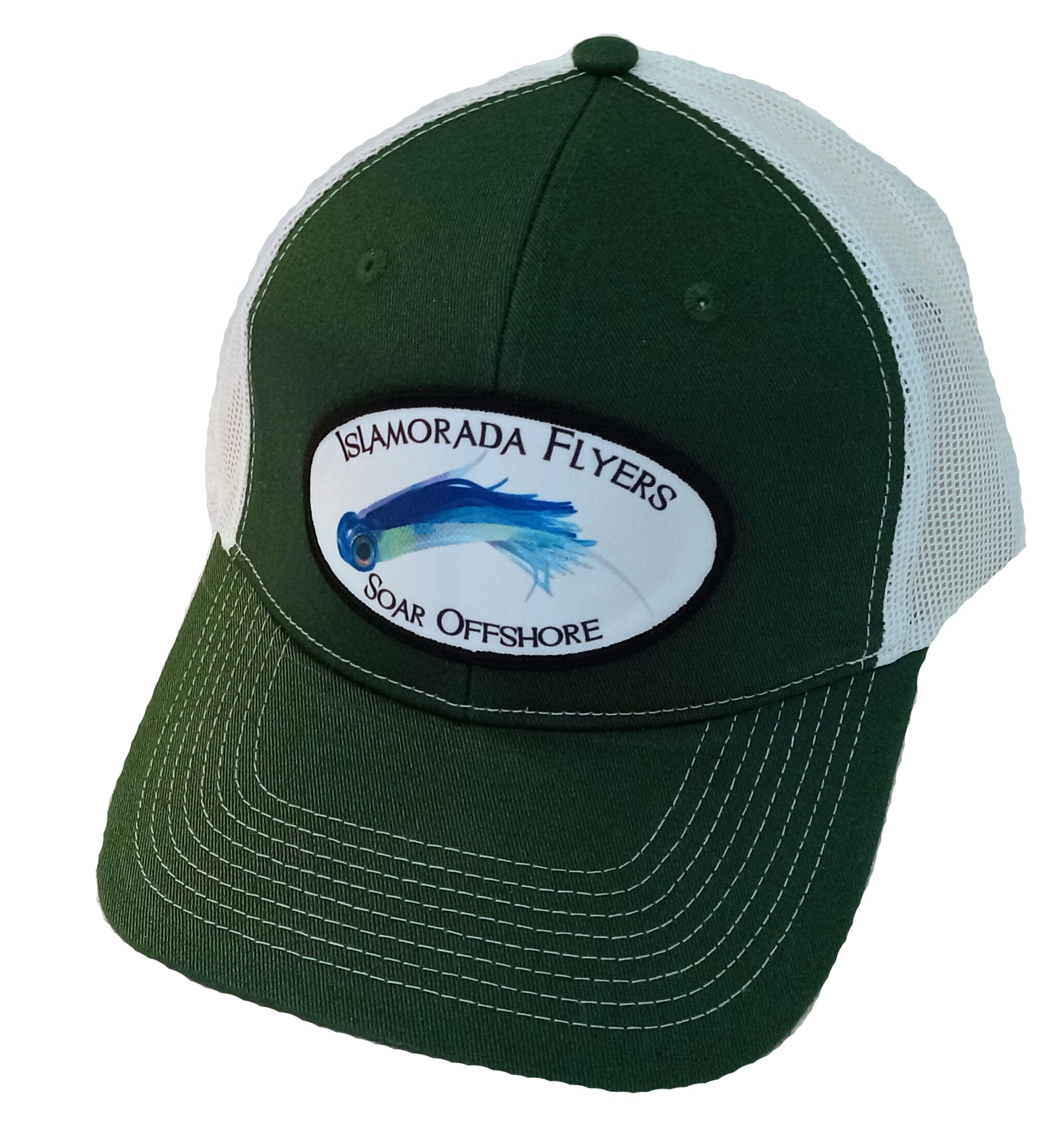 Exclusive Islamorada Flyers Trucker Hat with front patch logo. Adjustable Port Authority, 5 Panel, C112 Trucker Hat.